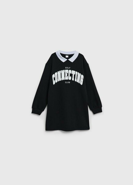Платье трикотажное для девочек. Футер без начёса. Посадка - свободная. Длина - до колена. Спущенный рукав на манжете. Круглый вырез горловины с отложным воротником. Принт. Страна производства: Китай.
