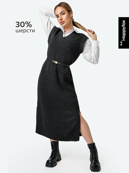 Создай уютный образ, о котором долго мечтала! Невероятно мягкое женское платье-жилет из акрила и шерсти поможет забрать с собой частичку домашнего тепла на работу или на романтическое свидание. Удлиненный силуэт, элегантный V-образный вырез, изящные разрезы по бокам – в этом сером платье для женщин есть все, что поможет оставаться стильной в любой ситуации! Вязаное трикотажное полотно из хлопка и шерсти делает сарафан onesize теплым и идеальным для осенней погоды и даже зимних дней. Благодаря добавлению акрила демисезонное платье не вытягивается даже после частых стирок. Платье-жилетка миди дарит комфорт благодаря свободному крою. Нежная фактурная вязка делает образ уютным, а V-вырез и разрезы добавляют нотку кокетства. Сарафан из вязаного трикотажа поможет создать трендовый офисный образ. Однотонная модель единого размера станет базовой основой для повседневных образов в стиле smart casual (смарт кэжуал) в весенние дни. Утепленное платье не оставит девушку незамеченной на прогулке осенью и морозной зимой. Длинный сарафан ниже колен станет идеальным дополнением школьного гардероба для подростков. Элегантное платье оверсайз – отличный вариант в школу для старшеклассниц, которые хотят выглядеть сдержанно, но при этом стильно. Внимание: ремень в комплект не входит.