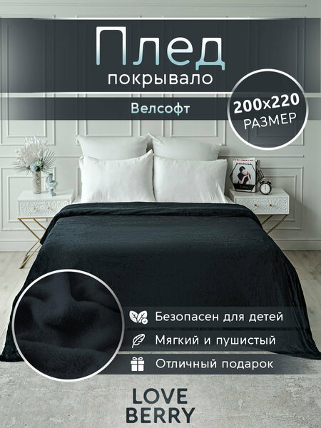 Плед 200х220 LOVEBERRY из велсофта Евро в спальню однотонный, черный