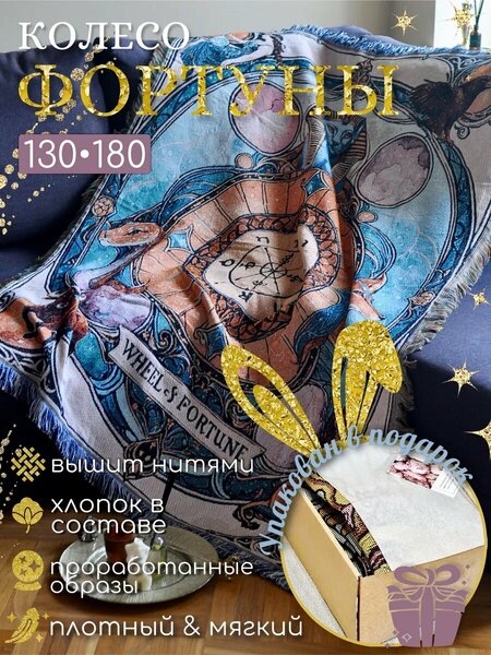 Если вы искали необычный подарок подруге на Новый год, то это он - новогодний подарочный плед Колесо Удачи! В подарочный набор входит: качественная крафтовая коробка, мотивационная открытка с аффирмацией на изобилие. Упаковано с чистыми помыслами и добрыми намерениями, очень красиво и аккуратно, бери и дари! P. S. конечно, на лицевой стороне открытки изображён символ удачи - Колесо Фортуны, такой же, как на самом дизайне пледа, ведь мы разрабатывали его со знанием дела Откройте для себя магию и уют с пледом "Колесо Фортуны". Этот уникальный плед не только согреет вас в холодные вечера, но и привнесет в ваш дом атмосферу мистики и загадочности. Дизайн пледа имитирует карту Таро с арканом "Колесо Удачи", символизируя изменения, удачу и циклы жизни. Плед выполнен из высококачественных материалов, что обеспечивает комфорт и долговечность. Плед "Колесо Фортуны" станет идеальным подарком для любителей Таро и тех, кто ценит необычные и стильные вещи для дома. Завернувшись в этот плед, вы ощутите поддержку и вдохновение, которые приносит аркан "Колесо Фортуны", и ощутите, как волшебство проникает в вашу жизнь. Сделайте ваш дом уютнее и волшебнее с пледом "Колесо Фортуны"! Этот безупречный гобеленовый коврик для пляжа и пикника с мистическим принтом в стиле карт Таро и бохо соткан из плотной, невероятно прочной хлопковой ткани (НЕ печать!). Рисунок со временем не сотрётся и не выцветет, так как сам принт (рисунок) вышит из высококачественных и износостойких нитей. Его можно использовать даже на природе и на море - возьмите эзотерический плед покрывало с собой на пикник, не стесняя себя в площади, ведь этот плотный гобелен легко может стать прекрасным большим ковриком для поездки на пляж на море или на природу! Его размер составляет 180 см на 130 см - можно уместиться во весь рост или использовать как домашний эстетичный декор! Винтажный плед-покрывало упакован в плотный зип-пакет. Нескользящий плед в стиле бохо подойдёт как на диван, так и на кресло или кровать. Кому подойдёт такой подарок? Несомненно, мы рекомендуем подарить этот плед близкому человеку, который ценит и любит создавать уют дома или в поездке, на пикнике и на море или на даче, а также ценит эстетичный домашний декор! Плед пляжный на море для ценителей эстетики эзотерики и магии, духовности или астрологии. Универсальный подарок любимой сестре или подруге, человеку, который любит эстетику карт таро. Праздники Новый год, день рождения - также уместный повод для такого особенного подарка с винтажным дизайном и изображением Колеса Фортуны (Удачи)! Этот необычный яркий плед с изображением карты Таро привлечет внимание любителей мистики, астрологии и духовных практик. Великолепный дизайн, вдохновленный таинственными символами карты таро Колеса Фортуны, добавит загадочности и уюта в ваш дом. Он также подойдёт как накидка на кресло, кровать или диван. Особенности пледа: Интригующий дизайн: Яркий 10 аркан Таро “Колесо Фортуны” с детальными иллюстрациями персонажей классического изображения. Качество материала: Изготовлен из мягкого и приятного на ощупь хлопка (+полиэстер). Универсальное использование: Подходит для холодных вечеров на диване, как покрывало на кровать или даже для пикника на природе или на пляже, мистического декора помещения. Отличный подарок: Идеальный подарок для подруги, 
