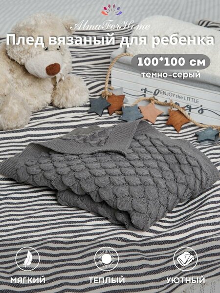 Плед вязаный детский хлопковый для новорожденного , плед для ребенка хлопковый в коляску , на выписку , на кровать для малыша AlmaForHome 100х100 см / темно-серый