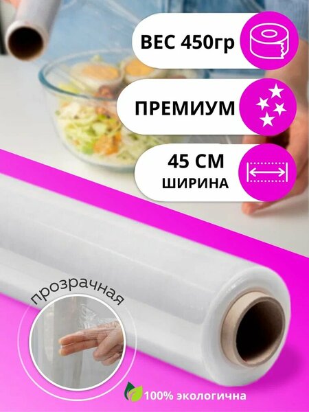 Пищевая пленка для продуктов PRO Cleanly – незаменимый хозяйственный товар для каждого дома. Это удобное и практичное решение для хранения в холодильнике продуктов и предметов. Она надолго сохранит свежесть и полезные свойства вашей еды. Поможет избавиться от смешивания запахов в холодильнике. Защитит продукты от влаги, пыли и заветривания. Поэтому с ее помощью можно хранить даже свежую выпечку, готовые блюда и полуфабрикаты. Стрейч пленка идеально подходит для косметических процедур, как в домашних условиях, так и в косметологических кабинетах. Она усиливает термоэффект и действие маски или крема. Ее можно использовать в SPA-салонах и банных комплексах для антицеллюлитного обертывания тела. Бьюти-мастера активно пользуются пленкой при ламинировании и перманентном макияже – для бровей и лица. Также ее используют для защиты и быстрого заживления тату. Пищевая пленка в рулоне подходит для упаковки любого багажа и посылок. Она поможет сохранить ваши вещи от грязи и влаги при ремонте и переезде. Предотвратит высыхание жидкости в тюбиках и банках. Длина пленки в рулоне 450 м, ее хватит надолго. Ширина – 45 см. Она хорошо тянется и устойчива к разрывам. Пленка плотная – 10 мкм, поэтому она хорошо защищает от посторонних запахов и повреждений. Температура использования 0-25 градусов. Она прозрачная, через нее хорошо видны продукты или вещи. Полностью экологична, без посторонних химических запахов. Приобретайте нашу большую многофункциональную пленку - и ваша еда будет всегда свежей, а вещи надежно упакованными!