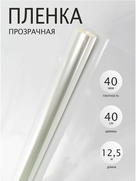 Пленка прозрачная 40см x 0,2кг. Пленка является одним из востребованных материалов у флористов. Прозрачная пленка для цветов и подарков это недорогой упаковочный материал, который легко сочетается с другими видами упаковки. Вы легко подберете к ней необходимые аксессуары и дополнения в виде лент, наклеек, страз и т. д. Прозрачная пленка подойдет не только для упаковки подарков и оформления цветочных композиций. Ее также применяют для составления съедобных букетов, композиций в корзинах, для упаковки подарков из косметики, кондитерских изделий и т. д. Часто ее приобретают для творчества и рукоделия. Плотность 40 мкм. Ширина 40см. Длина 12,5м. Универсальная, плотная, влагостойкая.
