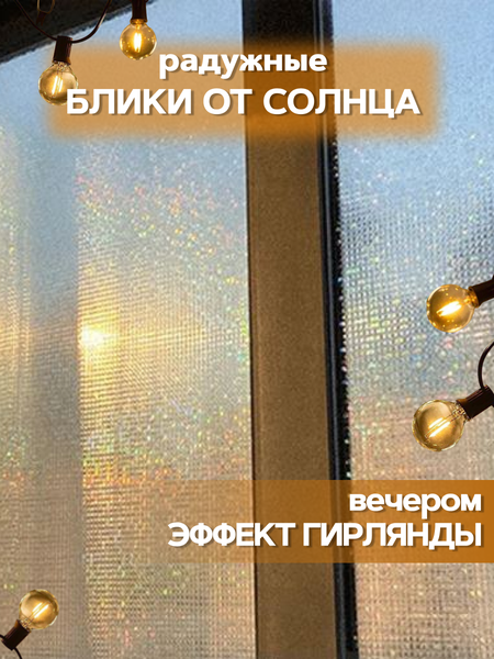 Витражная статическая пленка без клея подходит для декорирования и установки на комнатные и балконные окна, стеклянные двери и перегородки, дверцы шкафов и полок, а также дверцы и перегородки душевых кабин. Пленка со статическим эффектом без клея, легко удаляется с окон и не требует дополнительной обработки от возможных остатков клея. Крепится легко и быстро за счет статических сил при помощи воды, при этом возможна корректировка. Специальная защитная подложка на пленке сохранит статический эффект на долгое время. ( Не забудьте ее снять при наклеивании). Самоклеющаяся пленка хорошо пропускает дневной свет в помещение. Оконная плёнка эффективно защищает помещения, мебель или растения от избыточного ультрафиолетового излучения, а также обеспечивает необходимую приватность и защиту от постороннего внимания. Оконная плёнка не затемняет помещение, пропуская 85% солнечного света и тепла, в то же время, отражая 95% ультрафиолетового излучения. Лицевая поверхность обладает эффектом «радуги» - при попадании солнечных лучей на плёнку свет преломляется, превращая окно в яркий витраж, украшающий и подчёркивающий интерьер, а также защищающий от любопытных взглядов. Оконная плёнка крепится на любую гладкую поверхность благодаря эффекту прилипания, возникающему из-за действия сил электростатического притяжения. Отсутствие клеевого слоя позволяет использовать плёнку многократно без вреда для стёкол, например, крепить на балконные окна в летний период и снимать в зимний. Плёнка не боится перепадов температуры и влажности и сохраняет свои свойства под воздействием прямых солнечных лучей. Для установки плёнки на стекло предварительно очистите поверхность, удалите защитный слой с плёнки и прикрепите плёнку к поверхности, разглаживая от центра к краю. При повторном прикреплении рекомендуется смачивать поверхность водой. При необходимости плёнка легко режется ножницами для получения фрагментов требуемого размера и формы. С помощью пленки вы сможете изменить привычный вид: стекол, окон, дверей, элементов мебели, а также скрыть от сторонних взоров свое личное пространство. Это легкий способ привнести новизну в дизайн интерьера или сделать незаметными повреждения поверхностей предметов. Является стойкой к ультрафиолетовым лучам и обеспечивает стеклу дополнительную прочность. Преимущества: Отсутствие клея Простота нанесения и снятия Возможность многоразового использования Влагостойкая Можно мыть бытовыми щадящими моющими средствами. Нанесение пленки на стекло не требует специальных навыков и большого количества инструментов. Достаточно распылителя для воды, пластикового шпателя и канцелярского ножа: 1. Отрежьте полотно необходимого размера и снимите защитную пленку; 2. Обильно смочите окно водой; 3. Нанесите пленку на стекло и разгладьте её сверху вниз, вытесняя лишнюю воду; 4. Корректируйте расположение пленки на стекле, добавляя воду или отрезая излишки; 5. Протрите насухо тканевой салфеткой. Пленка изготовлена из ПВХ – это гибкий материал. Она обладает высокой прочностью, устойчивостью к воздействию влаги и ультрафиолетовых лучей, а также легко моется и не подвержена коррозии.