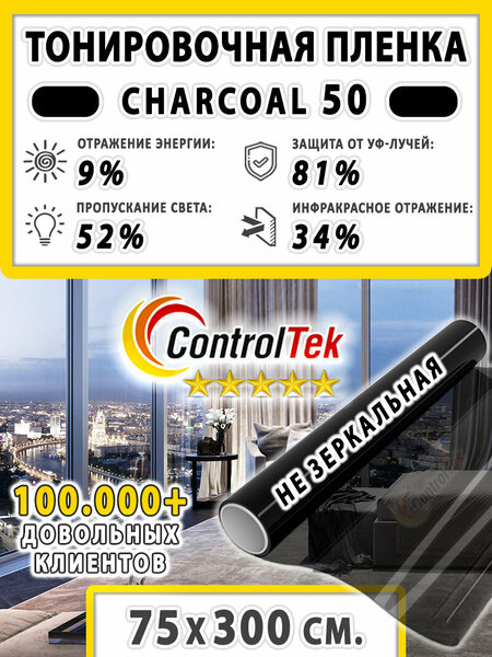 Пленка тонировочная для окон, Солнцезащитная пленка ControlTek CHARCOAL 50 (черная) 75х300 см. Самоклеящаяся на окна.