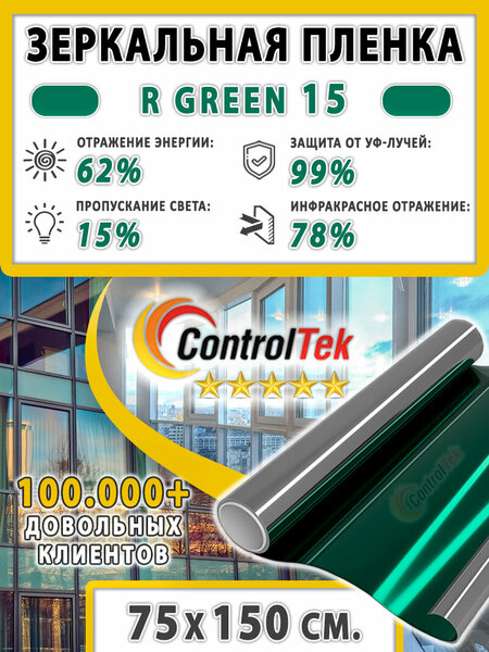 Солнцезащитная пленка ControlTek R GREEN 15 - зеленая пленка с зеркальным эффектом и светопропускаемостью 15%. Размер полотна: 75х150 см (0,75х1,5 метра). 2 mil = 56 мкм. Зеркальная пленка ControlTek Характеризуется повышенной способностью удерживать солнечные и тепловые лучи. Солнцезащитная пленка нужна для того, чтобы максимально отразить УФ- и инфракрасные лучи и при этом пропустить как можно больше видимого света. Солнцезащитные пленки ControlTek обладают теплоотражающими качествами, благодаря чему позволяют экономить электроэнергию. Эффект достигается за счет отражения тепла, идущего в помещение снаружи в летний период (поддержание комфортной температуры без использования кондиционера), а также того, которое направляется наружу в зимнее время (сохранение тепла, вырабатываемого электроприборами для обогрева). Благодаря металлизированному напылению, срок службы зеркальной пленки ControlTek более 10 лет, она блокирует вибрации на стеклах и создает эффект шумоизоляции. Зеркальная тонировка является прекрасным декоративным решением, как внутри помещения, так и снаружи. . Солнцезащитная пленка ControlTek защищает от солнечных лучей, не растрескивается, не расслаивается, не иссыхается в процессе эксплуатации. Самоклеющаяся пленка ControlTek легко монтируется, клеится, разглаживается, не оставляя пузырей и складок на стекле. Покрытие легко моется, чистится, остается красивым и блестящим на протяжении срока службы. . Ваши выгоды от установки солнцезащитной пленки ControlTek: 1. Зеркальная плёнка ControlTek блокирует вредные ультрафиолетовые лучи и инфракрасное излучение, пропуская в помещение чистый естественный свет. 2. Солнцезащитная плёнка ControlTek защищает мебель и предметы интерьера от выгорания. 3. Пленка для окон ControlTek создает комфортные условия для нахождения в помещении. Она отражает солнечную энергию и препятствует нагреву от солнца, создавая комфортный климат внутри помещения. 4. Оконная пленка ControlTek обладает эффектом энергосбережения. В холодное время года теплосберегающая пленка способствует сохранению тепла, абсорбирует его и отражает обратно в помещение. В летний период теплоотражающая пленка ControlTek блокирует проникновение солнечной энергии в помещение и сохраняет комфортную атмосферу. 5. Пленка на окна ControlTek скрепляет стекло и предотвращает рассыпание осколков при нарушение цельности, оберегая Вас и Ваших близких от порезов осколками. 6. Зеркальная пленка ControlTek является прекрасным декоративным решением, как внутри помещения, так и снаружи. 7. Светоотражающая пленка ControlTek устраняет солнечные блики (свет не препятствует просмотру телевизора и работе за компьютером). 8. Тонировочная пленка ControlTek обладает улучшенными антицарапными свойствами, что позволяет ухаживать за ней как за обычным стеклом и увеличивает срок службы. 9. Солнцезащитная пленка имеет толщину 1,5 mil, что позволяет легко с ней работать (она не заламывается так легко, как более тонкие пленки, поэтому для непрофессионала с ней проще работать). 10. Гарантия на плёнку для окон ControlTek составляет 5 лет. Срок службы более 10 лет. Мы являемся эксклюзивным поставщиком такой солнцезащитной плёнки на рынке РФ уже более 5 лет. На рынке защитных архитектурных пленок мы работаем с 2008 года и за этот период нами накоплен огромный опыт подбора качественных пленок. . Характеристики пленки ControlTek R GREEN 15: Пропускание 