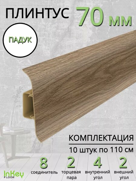 Комплектация: 1- плинтус пластиковый 70мм высокий - 10шт по 1,1 метра 2- наружный угол для плинтуса - 2шт 3- внутренний угол для плинтуса - 4шт 4- торцевая пара (заглушка левая и правая) - 2 комплекта 5- соединитель плинтуса - 8шт *центральная планка съемная Напольный плинтус пластиковый высотой 70 мм — это современное и практичное решение для отделки интерьера. Комплект из 10 штук длиной по 1,1 метра подходит для оформления пола в жилых и коммерческих помещениях. Идеально сочетается со многими стилями и дизайнами в квартире и доме. Плинтус выполнен из качественного пластика, который устойчив к воздействию влаги, что делает его идеальным выбором для кухни, ванной комнаты или других помещений с повышенной влажностью. Материал не подвержен гниению, плесени и деформации от воды, обеспечивая долговечность и аккуратный вид на протяжении всего срока службы. Комплект включает все необходимые элементы для удобного монтажа. Съемная центральная планка упрощает установку кабелей внутри плинтуса, скрывая провода от глаз. Это удобно при обустройстве современных интерьеров с акцентом на функциональность. Высокая конструкция позволяет эффективно закрывать щели между стеной и полом, придавая комнате законченный вид. Плинтус также защищает нижнюю часть стены от повреждений при уборке или перемещении мебели. Благодаря стильному внешнему виду плинтус может использоваться как бордюр в кухонных зонах или как декоративный элемент у столешницы. Его легко сочетать с керамическим покрытием, деревянным настилом или ламинатом. Этот аксессуар подходит для оформления пола в жилых комнатах, кухнях и даже прихожих. Дополнительные преимущества: - Широкий профиль подчеркивает современный стиль. - Простота ухода: гладкая поверхность быстро очищается от загрязнений. - Универсальность: можно использовать как настенный бордюр или фартук вдоль плиточного покрытия. Дополнительный набор комплектующих: артикул - 339121764 *вбивать артикул следует в строку поиска (только цифры)