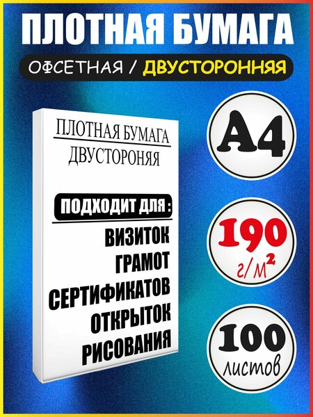 Надежная и универсальная чистоцеллюлозная без покрытия, высококачественная плотная, экологически чистая, белая и безопасная офисная бумага для принтера и рисования. Используется для печати многокрасочных изданий с длительным сроком использования (книг, журналов, газет, рекламной и бумажно-беловой продукции, годовых отчетов, бланков документов, брошюр, грамот, наград, открыток, дипломов, сертификатов, похвальных писем, пригласительных, каталогов, журналов, брошюр, плакатов, визиток, престижных книг, визитных карточек, альбомов, бланков документов, конвертов, письма, каллиграфии и т. д). Подходит для печати на принтере, шелкотрафаретной печати, цифровой печати, офсетной печати, тиснения, каллиграфии. Также бумага подходит для ламинирования. В упаковке 100 листов / Формат А4 / Плотность 190 г/м2 / Двусторонняя / Премиум качество / Класс A+ / Цвет белый / Гладкая поверхность / Беcкислотная Acid-free paper / Высокая степень белизны 145 % / Экологические стандарты EU Ecolabel, FSC Mix / Экологически чистые и безопасные, без тяжелых металлов / Производство Россия. Бумага для принтера / Бумага для оргтехники / Бумага для офиса / Плотная бумага А 4 для принтера / Плотная бумага для печати / Бумага для лазерного принтера / Бумага для рисования / Бумага для маркеров / Бумага для графики / Плотная бумага для рисования / Бумага А4 для лазерного принтера / Белая бумага / Бумага для цифровой печати / Офсетная бумага / Бумага для грамот / Бумага для дипломов / Бумага для открыток / Бумага для сертификатов / Бумага для пригласительных.