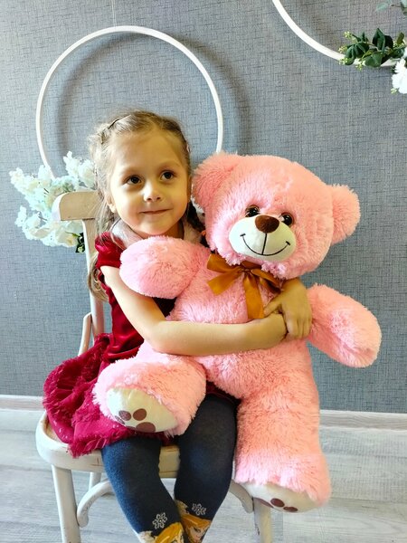 Достоинства:Классный медведь! Весëлая мордашка. Недостатки:Нет Комментарий:Внучке понравился. Такой как она хотела. Сделано в Беларуси. На самом деле более розовый чем на фото, это из-за освещения