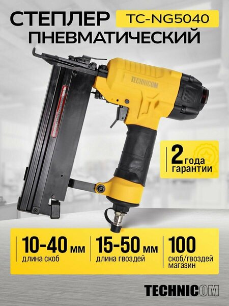 Пневматический степлер TECHNICOM TC-NG5040 это мощный инструмент, который применяется для работ с такими материалами как дерево, пластик, бетон, рубероид, кожа, ткани. Корпус пневмостеплера выполнен из прочного алюминия, обрезиненная ручка не скользит в руке. В данной модели предусмотрена защита от случайного пуска и регулировка глубины забивания. Вместительный магазин позволяет использовать 100 гвоздей или скоб на выбор. Для выполнения работ могут применятся гвозди длинной 15-50 мм или скобы длинной 10-40 мм. TC-NG5040 станет незаменимым помощником как в быту, так в профессиональной деятельности.