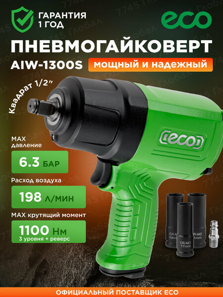 Пневмогайковерт ударный 1/2" ECO AIW-1300S (ЕС3914-5) - это профессиональный инструмент, который станет незаменимым помощником в работе с крепежом. Инструмент оснащен трехступенчатой регулировкой крутящего момента, что позволяет точно настроить усилие затяжки в зависимости от материала и размера крепежа. Функция реверса обеспечивает возможность закручивания и откручивания крепежа в обоих направлениях, что значительно упрощает работу и сокращает время на выполнение задачи. Пневмогайковерт укомплектован тремя сменными головками из высококачественной легированной стали размером 17, 19 и 21 мм. Это позволяет использовать инструмент для работы с различными размерами крепежа. Корпус инструмента выполнен из прочного материала, устойчивого к износу и повреждениям. Эргономичный дизайн обеспечивает удобство и комфорт при длительной работе.