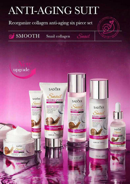Подарочный антивозрастной набор для лица Sadoer с муцином улитки и коллагеном Sadoer - ваш идеальный путь к совершенству кожи! Этот набор включает в себя 6 необходимых предметов для ухода за кожей лица, которые помогут вам достичь максимального эффекта. От тонера для лица до крема вокруг глаз, каждое средство разработано с использованием самых передовых технологий и натуральных ингредиентов, чтобы подарить вашей коже нежность, увлажнение и защиту. В составе набора: 1. Пенка для умывания, 100 г. Мягкая и очищающая пенка, которая бережно удаляет загрязнения, излишки кожного сала и макияж, не пересушивая кожу. 2. Тоник для лица, 120 мл. Нежное средство для освежения и увлажнения кожи лица, которое помогает подготовить кожу к следующим этапам ухода. 3. Крем для области вокруг глаз, 20 г. Специально разработанный крем, который уменьшает отечность и темные круги вокруг глаз, увлажняет и ухаживает за нежной кожей в этой области. 4. Сыворотка для лица, 30 мл. Интенсивное увлажняющее средство с мощными активными ингредиентами, которые улучшают текстуру и тон кожи. 5. Лосьон для лица, 120 мл. Легкий уход, который дарит коже свежесть и увлажнение, создавая идеальную основу для нанесения макияжа или следующих этапов ухода. 6. Крем для лица, 50 г: Богатый увлажняющий крем, который питает и защищает кожу, помогает восстановить естественный баланс и улучшает упругость.