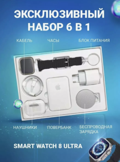 Подарочный набор 6 в 1 - это эксклюзивный набор, включающий в себя смарт-часы, наушники, блок питания на 20 Вт, провод, magsafe зарядку и повербанк magsafe. Смарт-часы - это современное устройство, которое сочетает в себе функции часов и смартфона. Они позволяют оставаться на связи, отслеживать свою активность, получать уведомления и многое другое. Наушники - еще один важный элемент набора. Они обеспечивают качественное звучание, позволяя наслаждаться музыкой в любое время и в любом месте. Блок питания на 20 Вт - это мощный и компактный аксессуар, который позволяет быстро и эффективно заряжать устройства. Magsafe зарядка - это удобный и надежный способ зарядки ваших устройств без необходимости использования дополнительных проводов. Повербанк magsafe - это портативное зарядное устройство, которое позволяет заряжать ваши устройства в любое время и в любом месте. В целом, подарочный набор 6 в 1 - это отличный выбор для тех, кто ценит качество, функциональность и стиль.