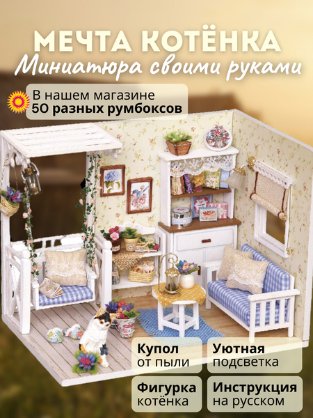 В наборе 160 деталей для сборки: деревянная мебель, ткань, керамика, бусины, кружево, специальный клей, иллюстрированная инструкция на русском языке, фигурка котёнка, пинцет, уютная подсветка, прозрачный купол для защиты от пыли. Соберите своими руками атмосферный домик комнату 170x110x130 мм или подарите набор подруге, маме, дочери, близкому человеку! Румбокс от Cute Room – отличная идея для подарка. Сборка румбокса – прекрасная медитация, позволяющая отключиться от повседневной рутины. Рукоделие доставит лишь позитивные эмоции, ведь всё необходимое будет под рукой. Готовый домик можно использовать в качестве ночника. Миниатюра Yarvita создаётся шаг за шагом: собирается деревянная мебель и детали интерьера из ткани, синтепона, бусинок, проволоки, кружева и т. д. Расставляются кукольные цветы, книги, посуда, приклеиваются обои, проводится освещение. В итоге получится реалистичный макет домика.