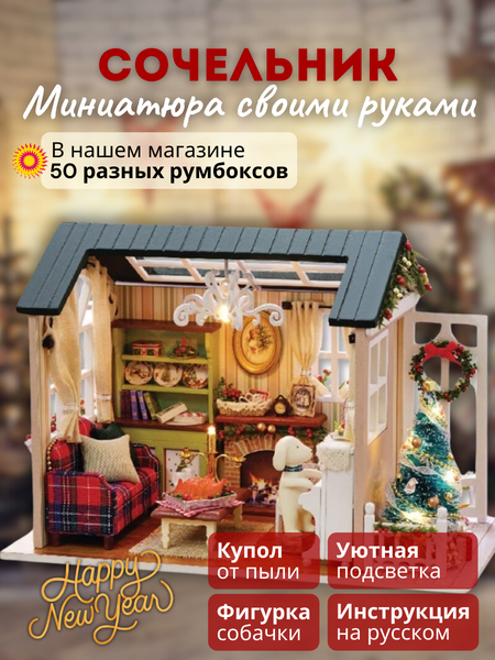 В наборе 200 деталей для сборки: деревянная мебель, ткань, искусственные растения, бусины, кружево, специальный клей, иллюстрированная инструкция на русском языке, пинцет, уютная подсветка, фигурка собачки, праздничная гирлянда, прозрачный купол для защиты от пыли. Соберите своими руками небольшой рождественский домик 210x130x160 мм или подарите набор подруге, маме, дочери, близкому человеку! Румбокс от Cute Room – отличная идея для подарка. Сборка румбокса – прекрасная медитация, позволяющая отключиться от повседневной рутины. Рукоделие доставит лишь позитивные эмоции, ведь всё необходимое будет под рукой. Готовый домик можно использовать в качестве ночника. Миниатюра Yarvita создаётся шаг за шагом: собирается деревянная мебель и детали интерьера из ткани, синтепона, бусинок, проволоки, кружева и т. д. Расставляются кукольные цветы, книги, посуда, приклеиваются обои, проводится освещение. В итоге получится реалистичный макет домика.