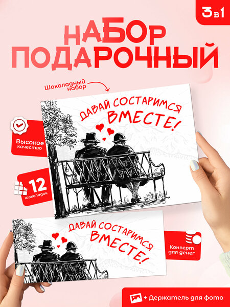 Подарочный набор 3 в 1 "Состаримся вместе" - это оригинальный и запоминающийся подарок на любой случай жизни. В состав набора входят: 1) шоколадный набор из 12 мини-плиток шоколада, каждая из которых обернута в индивидуальную этикетку с милыми пожеланиями, 2) стильный конверт для денег (картон), 3) подставка для фотографии (картон). Этот подарочный набор можно использовать как дополнение к основному подарку, или как приятный сюрприз без повода. Яркое красочное оформление и милые надписи не оставят ваш подарок без внимания. Выбирая подарочный набор "Состаримся вместе", вы делаете оригинальный и запоминающийся подарок, который обязательно порадует ваших близких и друзей.