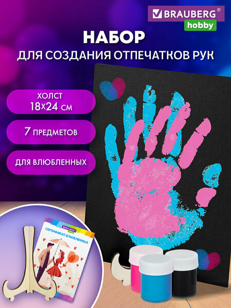 Подарочный набор для рисования парные отпечатки рук влюбленных на холсте 18х24 см, акриловые краски 3 цвета, кисть, сертификат, подставка в подарок, Brauberg Hobby, 192527