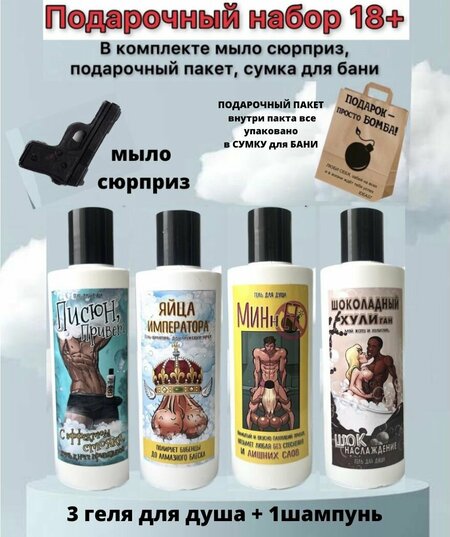 Феерический подарок для стильных мужчин. В наборе 3 геля для душа,+ 1 шампунь-гель, мыло сюрприз, сумка для бани+ подарочный пакет с прикольной надписью. Подарок с юмором, подарок с приколом, гель для душа, гель для мужчин. Этот подарочный набор однозначно заставит улыбнуться, принесет море позитивных эмоций и останется в памяти на долгие года! Вы можете подарить его просто так, без какого либо повода, просто, чтобы удивить, ради шутки и поднять настроение . Также, он станет отличный подарок или дополнением к подарку на день рождение, 14 февраля, 8 марта, и. т. д, Это отличный повод чтобы просто поднять настроение!