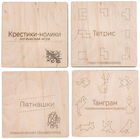 Подарочный набор из четырех игр-головоломок "Бери-дари". Крестики-нолики, пятнашки, танграм, тетрис деревянные.