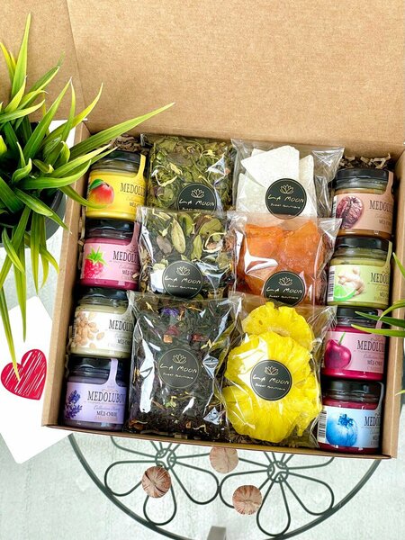 Медово-чайно-фруктовый подарок La Moon для любого события. Очень полезный и вкусный. Идеально подойдет в День Рождения, в знак благодарности или в качестве знака внимания для Вашего дорогого человека. В наборе: ❤️8 видов меда-суфле по 40 гр -со вкусом манго -с кедровыми орешками -со вкусом малины -со вкусом лаванды -со вкусом кофе -со имбирем и лаймом -со вкусом вишни -со вкусом голубики ❤️сушеные фрукты по 50 гр -натуральный кокос, -натуральный ананас -натуральная маракуйя ❤️3 вида чая : Состав черного чая «королевский десерт» 25 гр: Чай черный, шиповник, вишня, мальва, цукаты, клюква, календула. Состав зеленого чая «манговый рай» 25 гр: Зеленый чай, цукаты манго, мальва, боярышник, календула. Состав черного чая «таежный сбор» 25 гр: Чай черный, мальва, вишня красная, боярышник, листья брусники, мята, календула. Мы делали с любовью ❤️ А значит Вам будет очень вкусно!