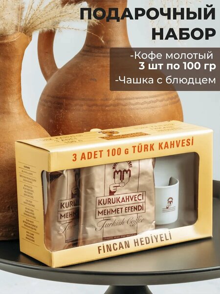 Подарочный набор от Mehmet Efendi. В комплекте: чашка с блюдцем, кофе молотый в мягкой пачке 3 шт. по 100 грамм. Прекрасный подарок для всех ценителей турецкого кофе. Напиток обладает плотной, слегка сиропной структурой. Помол очень мелкий, благодаря этому при приготовлении получается густая пенка . Кофе Mehmet Efendi обладает многогранным, сильным и насыщенным ароматом. Вся продукция Mehmet Efendi считается одной из лучших в мире. Приготовить можно в турке, кофеварке или другим любым способом. Каждый набор упакован в индивидуальную упаковку. Отличное решение для подарка на любой повод.