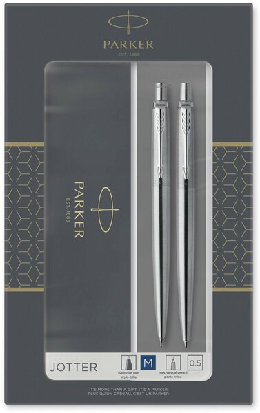 Подарочный набор Parker Jotter содержит перьевую и шариковую ручки модели Stainless Steel СT. Нержавеющая сталь на корпусе создает эффектный металлический блеск. Дизайн дополнен блестящими декоративными элементами из нержавеющей стали. Набор содержит подарочный футляр на две ручки из картона. Гарантия 2 года, еще + 2 года после регистрации на сайте производителя www.parkerpen.com Состав набора: шарик и механический карандаш + подарочный футляр Покрытие и материал корпуса, деталей отделки: нержавеющая сталь Материал подарочного футляра: картон Толщина линии письма: М, 0.5 HB Цвет чернил: синий Размер футляра, мм (ДхШхВ): 175х50х36 мм