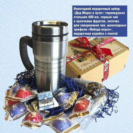 Подарочный набор : термокружка стальная 400мл, черный чай с кусочками фруктов, ситечко для заваривания чая, шоколадные трюфели «Победа вкуса», подарочная коробка с лентой и соломкой Новогодний подарок, подарочный набор с чаем и конфетами, Подарочный набор с чаем и конфетами, подарочный набор на 23 февраля, 8 Марта, для коллег, для друзей, для партнеров, сладкий подарок. br/> Подробнее. Шоколадные трюфели с марципаном Победа вкуса ассорти 2 вкусов (8 конфет) Голубые (4 шт.): Итальянские трюфели С марципаном И тертым грецким орехом В горьком шоколаде И темном какао В его основе сочетание классического сливочно-шоколадного «трюфельного сердца» с прослойкой из марципана - тертого миндального ореха. Изюминка этого вкуса а в том, что в трюфельную основу в этой конфете добавлен тертый грецкий орех. Состав: горький шоколад (тертое какао, сахар, масло какао, эмульгатор (лецитин соевый), натуральная ваниль), жир растительный, марципан (сахар, миндаль, вода, инвертный сироп, агент влагоудерживающий сорбитовый сироп, глюкозный сироп), сахар, сухое обезжиренное молоко, орех грецкий тертый, сливки сухие, масло какао, сыворотка молочная сухая, лактоза, какао-порошок, эмульгатор (лецитин соевый), ароматизатор (ванилин). В горьком шоколаде содержатся, не менее: общий сухой остаток какао – 72 %, масло какао – 33 %. Может содержать следы других орехов, арахиса, злаков. Не содержит ГМО. Красные (4 шт.): Трюфели С марципаном В горьком шоколаде И темном какао сочетание классического сливочно-шоколадного «трюфельного сердца» с прослойкой из марципана (тертого миндального ореха). Состав: горький шоколад (тертое какао, сахар, масло какао, эмульгатор (лецитин соевый), натуральная ваниль), марципан (сахар, миндаль, вода, инвертный сироп, агент влагоудерживающий сорбитовый сироп, глюкозный сироп), сахар, жир растительный, тертое какао, масло какао, сухое обезжиренное молоко, какао-порошок, сливки сухие, сухое цельное молоко, сыворотка молочная сухая, эмульгатор (лецитин соевый), ароматизатор (ванилин). В горьком шоколаде содержатся, не менее: общий сухой остаток какао – 72 %, масло какао –33 %. Может содержать следы других орехов, арахиса, злаков. Не содержит ГМО. срок годности-12 мес ГОСТ 4570-2014 Чай: Чай цейлонский и индийский крупнолистовой , цедра и кусочки апельсина, цветы граната, кусочки яблока, анис, корица. С добавлением натурального ароматизатора апельсина и ежевики