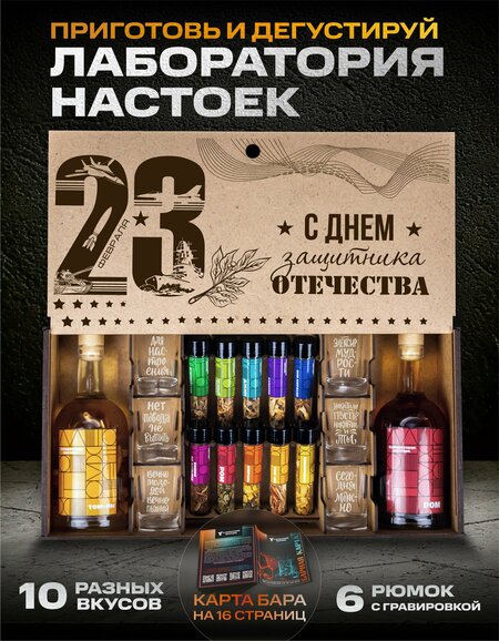 Посмотрите другие варианты набора - кликайте по кнопкам с указаниями веса под названием товара. Что подарить любимому человеку? Чем удивить того, у кого есть все? Wood Story представляет новинки в серии “Лаборатория настоек”. Преподнесите близким оригинальный деревянный мини бар с рюмками и травяными сборами в бутылях и колбах для создания изысканных алкогольных напитков. Подарочный набор из стеклянных стопок для водки и коньяка, виски и ликера, текилы и коктейлей - универсальный подарок. На рюмки нанесены прикольные надписи методом лазерной гравировки. Они не сотрутся даже при долгом использовании, мытье в посудомоечной машине. Стопки можно использовать для шотов - на шумных вечеринках с друзьями и семейных торжествах. Наполните бокальчики напитками собственного приготовления. 10 смесей для настаивания идут в наборе. Пара бутылей из прозрачного стекла продемонстрируют волшебные оттенки этих ассорти из природных ингредиентов для самогоноварения. На каждой бутылочке и пробирке - яркая цветная этикетка с названием и составом. Такой вкусный памятный подарок для взрослых - женщин и мужчин - универсальное решение для любого праздника. Набор алкоголя разных вкусов украсит любой стол и станет приятным сюрпризом для гостей. Стопки с коллекцией колб и бутылями размещены в оригинальной деревянной упаковке и переложены крафт бумагой - вручную, с любовью. В подарок - стильная карта бара на 16 страниц. В ней собраны рецепты авторских настоек и 50 видов коктейлей, которые вы можете приготовить на их основе. Красивые мужские и женские напитки точно понравятся вам и вашим близким. Станьте настоящим барменом для друзей и семьи! Эксклюзивный мини бар с рюмками и смесями для настаивания - с уникальной рецептурой от производителя. Такие домашние настойки гораздо вкуснее и намного полезнее обычного алкоголя. Они полностью натуральны и содержат только растительные компоненты - ягоды, фрукты, лепестки, специи, пряности, кедровую скорлупу, кору, коренья, травы. Набор “Лаборатория настоек” включает десять стеклянных пробирок и две бутылки с наполнением. Ощутите мягкое и богатое послевкусие и яркий травяной букет сложного бальзама Егермейстера, фруктовый с сухими пряными нотами Виски, экзотический аромат и острый вкус тайской перцовки Том-Ям, древесный дымный привкус Рома, яркий насыщенный - Вишни на коньяке, освежающий бриз Лимончелло, пикантный аромат Джина, сладкий апельсиновый драйв ликера Куантро, необычные нотки Блю Кюрасао, пикантный вкус сладко-горького Апероля. Напрямую от производителя. Создавайте домашние настойки на водке или самогоне. Почувствуйте ягодный вишневый, цветочный, дубовый, цитрусовый, перцовый ароматы. Напитки отобраны и протестированы нашими сомелье. Коллекция рюмок и сборов для крафтовых настоек - это оригинальный сюрприз. Пусть большой подарочный премиум набор станет особенным пожеланием и идеальным подарком для любого случая. Поздравьте самых близких, родных, любимых с 23 февраля - Днем Защитника Отечества! Порадуйте самых близких и родных людей - мужа и папу, брата и дедушку, парня и друга. Сын, внук и дядя, зять и тесть, свекор и отец, дед, батя, крестники и крестные, кумовья и друзья оценят такой набор для приготовления настоек. Подарите интересный бокс коллеге и клиенту, начальнику и начальнице, боссу и партнеру, со