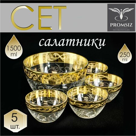 Набор стеклянных салатников изготовленных из высококачественного стекла, декорированного узором. Прекрасно подходит для подачи на стол салатов, сыра, фруктов, овощей и различных блюд. Салатники выполнены в узоре настроение имеют алмазную гравировку и напыление, а сочетание матового и червонного золота придают изделиям особый шарм. Салатники станут прекрасным дополнением сервировки, подойдут как для ежедневного Комплектация: Салатник 1500 мл - 1 шт; Салатник 250 мл - 4 шт;
