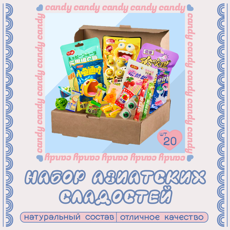 Внимание! Описание содержимого "Сюрприз бокса" находится разделе "Состав". Возможны незначительные изменения в составе товара. Оригинальный и необычный подарок, который придется по душе ребенку и взрослому, он будет чудесным сюрпризом к любому празднику! Хочется попробовать что-то новое, но не хотите тратить много денег? Самое время попробовать наш новый Сюрприз бокс с азиатскими сладостями! Набор собран с максимально разнообразными вкусовыми предпочтениями для любителей экзотики. Подарочная коробка состоит из самых вкусных азиатских сладостей: сладкий мармелад с разными вкусами, мега популярные кислые конфеты, фруктовые стики, леденцовые конфеты и многое другое. Состав: Азиатские сладости в количестве 20 штук: Конфеты жевательные с жидкой начинкой (Юла) - 1 шт, Мармелад с жидкой начинкой - 3 шт, Мармелад на ветряной мельнице (эмодзи) - 1 шт, Палочки йогуртовые или жевательная резинка в тюбике - 1 упак, Конфеты жевательные трубочки фруктовые - 2 шт, Конфеты кислый взрыв вкусов - 2 шт, Конфеты желейные со вкусом манго/кокос/кукуруза - 3 шт, Леденец на палочке (черника) - 1 шт, Зефир клубника - 1 шт, Леденцовая карамель и желейные конфеты (в ассортименте) - 5 шт.