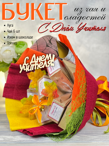 Представляем вашему вниманию эффектный подарок - чайный букет для учителей с набором чая ассорти и восточными сладостями! В первый осенний день 1 сентября (день знаний) наш подарочный набор учительнице в виде букета из чая в красивой бумажной упаковке с лентами ручной работы обязательно будет выделяться среди других своей яркостью! Сюрприз бокс -необычный знак внимания и заботы, подойдет учителю женщине и учителю мужчине. Подарочный набор продуктов питания- самый полезный подарок на выпускной начальной школы, 9 классов и 11 классов. Бюджетный подарок завучу на последний звонок и директору на окончание школы. Красивый презент на День учителя - отличная замена букету из живых цветов! Простоит очень долго, будет радовать любимого наставника своим видом и всегда пригодится, ведь этот напиток пьют все! Креативный подарочек на Новый год лучшему преподавателю. Милый дар учительнице начальных классов на 8 марта, День рождения и именины. Или дополнение к конверту с деньгами на юбилей и выпускной. Универсальное оформление подойдет для учителей разных предметов, классному руководителю- любому сотруднику школы и даже репетитору. Праздничный сладкий букет это натуральный продукт. В его составе настоящий листовой чай разных вкусов и конечно набор полезных сладостей: восточная сладость нуга со вкусами ассорти, изюм в шоколаде полезное лакомство для детей и взрослых, натуральный крем-мед и конечно же абрикос в шоколаде! Здесь вы сможете выбрать surprise box на любой даже самый изысканный вкус! Это и черный классический крупнолистовой чай; и зеленый чай с жасмином, медом, сухофруктами; полезный авторский фруктовый чай с яблоком, имбирем, мятой и мелиссой. Такой новогодний tea всегда будет уместен на любой праздник. Такой сладкий сувенир можно купить заранее и не переживать, что подарок испортится и завянет. Можно заказать сильно заранее - и спокойно ожидать вручения! Доставляется в транспортировочном коробе, внутри съедобный букет зафиксирован. Чай в специальных 3-х слойных пакетиках с зажимами для удобного многократного использования. Внимание! Размер и состав указан на фото! Дарите радостьиулыбки!