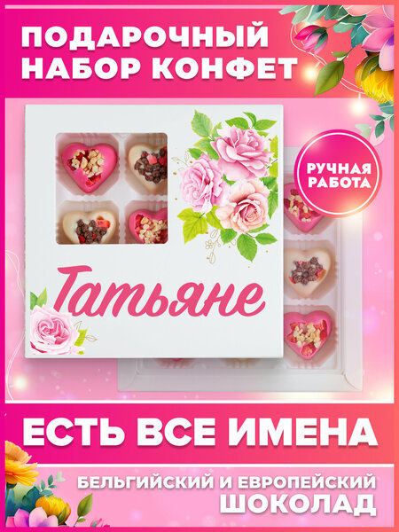 Набор шоколадных конфет - ассорти ручной работы из коллекции бренда K&O Chocolate - идеальный подарок по любому поводу! Именной набор для Тани и для девушек с любыми именами, включает 9 конфет из бельгийского и итальянского шоколада, которые выполнены в форме сердечка. Розовое или белое шоколадное сердце включает премиум - ингредиенты: вкусные семечки, большие орехи и маленькие орешки, карамель, рисовые шарики, сублимированные сушеные ягоды и другие компоненты, которые придают сладости оригинальный и неповторимый вкус. Конфеты ручной работы выполнены без добавления красителей, консервантов и ГМО, не только красивы, но и полезны: радуют нежным вкусом и поднимают настроение! Подарочная коробка белого цвета, с нежным цветочным рисунком, окошком с содержимым и именем одариваемой тщательно упаковывается в воздушно - пузырчатую пленку и дополнительную коробку из крафтового картона, чтобы вы получили свой заказ в лучшем виде! Сладкий подарок с эксклюзивным наполнением станет интересным знаком внимания для взрослой женщины, которую зовут Татьяна(Таня), для девушки - подростка или девочки, которой будет приятно получить персонифицированный презент со своим именем. Готовый набор в красивой коробочке с заботливым приготовлением от мастера - кулинара и нежным романтическим оформлением каждого изделия можно подарить любимой девушке Тане на годовщину отношений, милой бабуле или прабабушке Татьяне на день рождения. Съедобный презент - сладкий бокс станет необычным, но приятным и полезным сувениром для мамы, тещи или свекрови на юбилей, для коллеги или учительницы на Татьянин день, День учителя, для дочки, сестренки или внучки на женский день 8 Марта или любой детский праздник дома, в детском саду или в школе. Милая валентинка с вкусняшками внутри обрадует тетю Таню и племянницу Танечку, станет приятным сюрпризом для доченьки и мамочки - супруги на романтичный праздник День святого Валентина (День влюбленных) или День матери от папы и мужа. Правильный подарочек из настоящего шоколада для здорового питания в количестве 9 штук - конфеток доставит удовольствие счастливой начальнице Татьяне во время праздничного вечера или корпоратива, понравится любому человеку, которого зовут Танечка. Произведено в России. У нас есть акции и распродажи, вы можете купить наши товары в подарок со скидкой!
