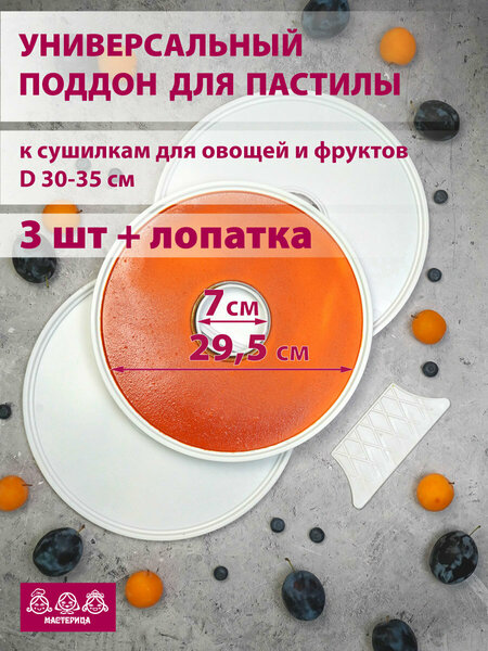 Поддон для пастилы Мастерица 3шт + лопатка PР-0503 универсальный D 29.5см к сушилкам для овощей и фруктов D 30-35см Диаметр поддона 295 мм, высота 14 мм, диаметр внутреннего отверстия 70 мм Съемный сплошной белый поддон предназначен для приготовления пастилы и десертов Номинальная загрузка 1 кг Первичный пищевой пластик Рекомендации по приготовлению витаминной пастилы на сайте www. masterica. ru Индивидуальная упаковка - пакет Универсальный поддон подходит для сушилок диаметром от 30см: Мастерица, Великие Реки, Волтера, Marta, Ветерок-2, Ротор, Ezidri, БелОМО, Garlyn, Суховей М