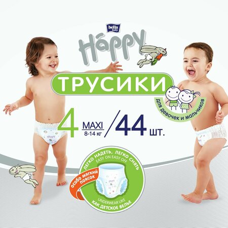 Подгузники - трусики Happy в размере MAXI (размер 4) для малышей весом 8-14 кг! Современная конструкция трусиков обеспечивает отличное впитывание и плотное прилегание к телу малыша, создавая комфорт при движении и во время сна. Разработанные для очень простого надевания и снятия, трусики помогают перейти к следующему этапу развития, когда малыш приучен к горшку. Наша гордость - особо мягкий И эластичный поясок! Ваш малыш будет очень доволен! - air flow technology – «дышащие» трусики - памперсы обеспечивают доступ воздуха к коже малыша; - underwear like - сидят и выглядят как детское бельё; - quick dry - специальный нетканый материал ускоряет распределение влаги по всей поверхности трусиков и обеспечивает чувство сухости; - easy on easy off - трусики легко надеть и легко снять, разорвав по шву.
