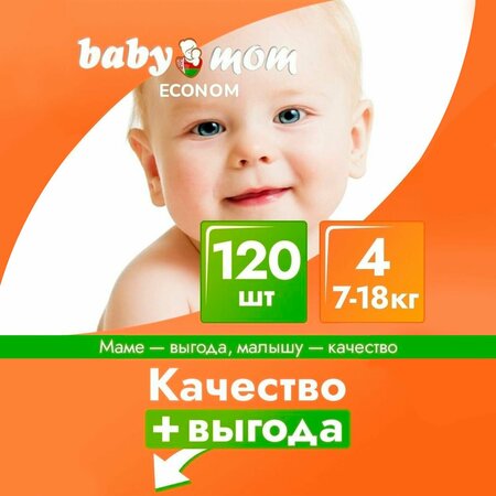 Мягкие детские подгузники Baby Mom Econom 4 размера L (7-18 кг) - это новый инновационный высококачественный продукт для бережной заботы о малыше. Мягкие и удобные одноразовые подгузники для мальчиков и девочек выполнены по стандартам европейского качества, при этом достаточно демократичны по цене и содержат в пачке 120 шт. Для изготовления памперсов используются нежные, словно хлопок, дышащие материалы. Эластичные боковины хорошо тянуться, садятся по телу вашей крохи и не допускают натирания, раздражения и покраснений. Каждый подгузник имеет специальный цветной индикатор влажности, который всегда подскажет, когда пришло время сменить подгузник. Высокая спинка и мягкие прилегающие к ножкам манжеты, которые надежно защищают края от протеканий обеспечивает комфортный ночной и дневной сон для вас и вашего малыша. Благодаря инновационной 3D системе впитывания, состоящей из нескольких слоев, кожа малыша будет оставаться сухой и днем, и ночью. Современный впитывающий слой памперсов содержит улучшенный абсорбирующий материал (SAP) и натуральную природную целлюлозу, что обеспечивает высокое поглощение влаги, не пропуская образующиеся испарения обратно, что помогает предотвращать появление покраснений и опрелостей. Специальная ADL-технология распределяет влагу по всей поверхности впитывающего слоя, не допуская образования комков. Самодельные марлевые подгузники не сравняться с нашей линией товаров для малышей изготовленных из натурального сырья по европейским стандартам. Приобретайте мягкие дышащие подгузники Baby Mom Econom обеспечат комфортный сон и безопасность для нежной и чувствительной кожи вашего малыша, а приятная цена поможет сэкономить семейный бюджет!