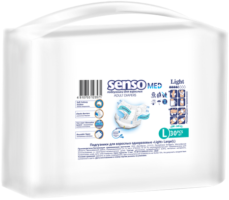 Senso Med Подгузники для взрослых Light L 100-145 30 шт. Подгузники для взрослых, размер L, обеспечивают гигиенические нормы пациентам с ограниченной физической активностью или лежачим больным с предписанным длительным постельным режимом. Подходят и мужчинам, и женщинам. Надежная защита от протекания и непревзойдённый комфорт пациента – визитная карточка модели. Люди с ограниченной подвижностью, лежачие находятся в сухом и чистом белье и не нуждаются в экстренном мытье. Подгузники компактны и удобны при длительном лежании. Внешний слой из дышащего нетканого текстиля осуществляет дыхание и вентиляцию кожи. Благодаря такой тонкой заботе кожа свободна от опрелостей и раздражений. Выделения и запах оказываются надежно закупорены в двойной слое впитывающего наполнителя. Есть дополнительная защита от протекания для блокировки стекания по ногам. Это мягкие бортики внутри по ногам. Мягкий, приятный текстиль не передавливает талию, сидит комфортно и надежно за счет двойной липучки по бокам. Когда наступит пора сменить белье, становится понятно по индикатору количества жидкости, которые находится в поясе спереди. Окружность талии: 100-145 см. Впитываемость: 4.5 капли