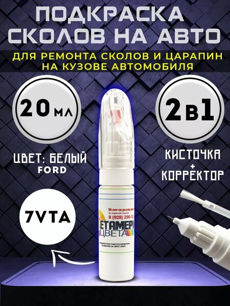 Подкраска сколов авто корректор + кисточка, 20 мл для автомобилей FORD, код краски 7VTA, название цвета FROZEN WHITE. Краска для автомобиля автоэмаль - цвет белый. Флакон в виде карандаша удобен в использовании для ремонта сколов и царапин на бампере, дверях авто, кузове, для окраски спецтехники, грузовиков, прицепов. Отлично подходит для работы по металлу, с пластиком, при малярных и отделочных работах для мебели, по дереву, керамических и гипсовых поверхностях - на всех деталях машин, мотоциклов, велосипедов, самокатов и др. транспортных средств, а так же в быту для ремонта сколов на металлических поверхностях бытовой техники. Для более идеального совпадения с основным цветом краски авто, при необходимости, возможно финишное нанесение лака для автомобиля. Просим обратить внимание, как правильно пользоваться нашей продукцией! Для использования кисточки, необходимо открутить флакон против часовой стрелки, держась за белый ребристый обод крышки. Маркер же открывается обычным движением вертикально вверх прозрачного колпачка, при этом НЕ прилагайте лишних усилий, не прокручивайте и тем более не старайтесь сместить прозрачный колпачок в стороны.