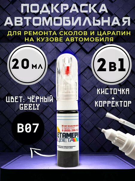 Подкраска сколов авто корректор + кисточка, 20 мл для автомобилей GEELY, код краски B07, название цвета BLACK. Краска для автомобиля автоэмаль - цвет чёрный. Флакон в виде карандаша удобен в использовании для ремонта сколов и царапин на бампере, дверях авто, кузове, для окраски спецтехники, грузовиков, прицепов. Отлично подходит для работы по металлу, с пластиком, при малярных и отделочных работах для мебели, по дереву, керамических и гипсовых поверхностях - на всех деталях машин, мотоциклов, велосипедов, самокатов и др. транспортных средств, а так же в быту для ремонта сколов на металлических поверхностях бытовой техники. Для более идеального совпадения с основным цветом краски авто, при необходимости, возможно финишное нанесение лака для автомобиля. Просим обратить внимание, как правильно пользоваться нашей продукцией! Для использования кисточки, необходимо открутить флакон против часовой стрелки, держась за белый ребристый обод крышки. Маркер же открывается обычным движением вертикально вверх прозрачного колпачка, при этом НЕ прилагайте лишних усилий, не прокручивайте и тем более не старайтесь сместить прозрачный колпачок в стороны.