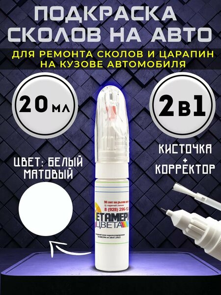 Подкраска сколов авто корректор + кисточка, 20 мл для автомобилей. Краска для автомобиля автоэмаль - цвет белый матовый. Флакон в виде карандаша удобен в использовании для ремонта сколов и царапин на бампере, дверях авто, кузове, для окраски спецтехники, грузовиков, прицепов. Отлично подходит для работы по металлу, с пластиком, при малярных и отделочных работах для мебели, по дереву, керамических и гипсовых поверхностях - на всех деталях машин, мотоциклов, велосипедов, самокатов и др. транспортных средств, а так же в быту для ремонта сколов на металлических поверхностях бытовой техники. Для более идеального совпадения с основным цветом краски авто, при необходимости, возможно финишное нанесение лака для автомобиля. Просим обратить внимание, как правильно пользоваться нашей продукцией! Для использования кисточки, необходимо открутить флакон против часовой стрелки, держась за белый ребристый обод крышки. Маркер же открывается обычным движением вертикально вверх прозрачного колпачка, при этом НЕ прилагайте лишних усилий, не прокручивайте и тем более не старайтесь сместить прозрачный колпачок в стороны.