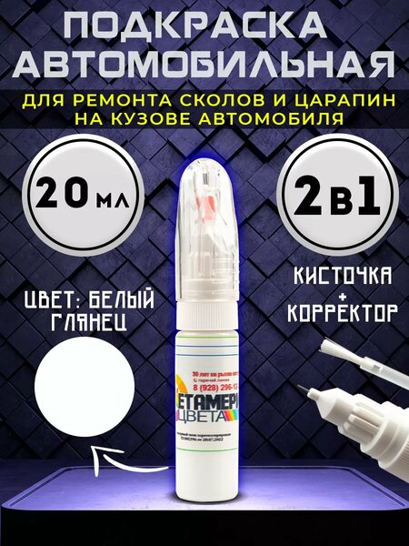 Подкраска сколов авто корректор + кисточка, 20 мл. Краска для автомобиля автоэмаль - цвет белый глянец. Флакон в виде карандаша удобен в использовании для ремонта сколов и царапин на бампере, дверях авто, кузове, для окраски спецтехники, грузовиков, прицепов. Отлично подходит для работы по металлу, с пластиком, при малярных и отделочных работах для мебели, по дереву, керамических и гипсовых поверхностях - на всех деталях машин, мотоциклов, велосипедов, самокатов и др. транспортных средств, а так же в быту для ремонта сколов на металлических поверхностях бытовой техники. Краска не требует финишного покрытия лаком. Просим обратить внимание, как правильно пользоваться нашей продукцией! Для использования кисточки, необходимо открутить флакон против часовой стрелки, держась за белый ребристый обод крышки. Маркер же открывается обычным движением вертикально вверх прозрачного колпачка, при этом НЕ прилагайте лишних усилий, не прокручивайте и тем более не старайтесь сместить прозрачный колпачок в стороны.