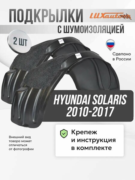 Подкрылки с шумоизоляцией передние неоригинальные Hyundai Solaris 2010-2017 сед, хб Материал: полиэтилен низкого давления. Сверху на подкрылок наклеивается специальный шумопоглощающий материал. . Способ крепления: на штатные места предусмотренные производителем (для лучшей фиксации локера возможно использование саморезов). Крепёж: не требуется. Преимущества подкрылков (локеров)-: Легко поставить. Точно повторяют геометрию кузова. Высокая точность изготовления. Качественный пластик. Не ломается. Дополнительная шумоизоляция автомобиля. Наличие отверстий под штатный крепёж (при условии наличия штатных мест на автомобиле)