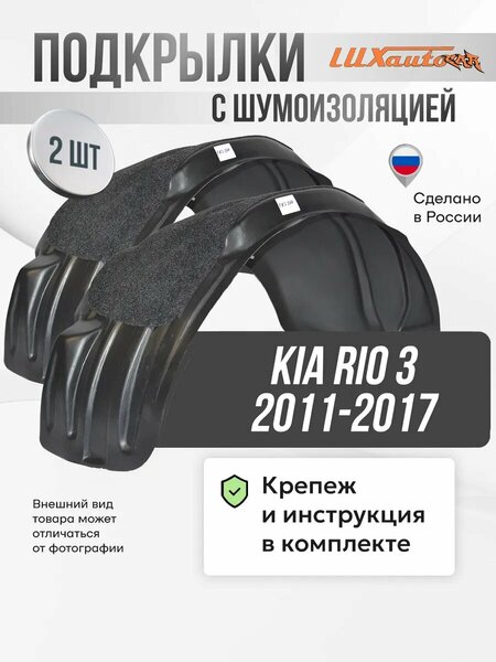 Подкрылки с шумоизоляцией передние неоригинальные Kia Rio 3 2011-17 Материал: полиэтилен низкого давления. Сверху на подкрылок наклеивается специальный шумопоглощающий материал. . Способ крепления: на штатные места предусмотренные производителем (для лучшей фиксации локера возможно использование саморезов). Крепёж: не требуется. Преимущества подкрылков (локеров)-: Легко поставить. Точно повторяют геометрию кузова. Высокая точность изготовления. Качественный пластик. Не ломается. Дополнительная шумоизоляция автомобиля. Наличие отверстий под штатный крепёж (при условии наличия штатных мест на автомобиле)