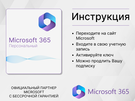 Активация без "танцев с бубном" Не нужно ожидать окончания подписки. Активируйте в любой момент. Подписка Microsoft 365 Персональный на 3 месяца для 1 пользователя, на 5 устройств/ПК/MAC. Включает в себя: - Word, Excel, PowerPoint, OneNote, Outlook, Teams, Microsoft Editor, Access (только ПК), Publisher (только ПК) - 1 ТБ в облачном хранилище OneDrive - 60 минут для звонков по Skype ежемесячно Подходит для Windows или Mac, а также для Android или iOS. Выбирая Microsoft 365 Персональный, вы получаете доступ к широкому спектру офисных приложений, включая Word, Excel, PowerPoint, OneNote, Outlook, Teams, Microsoft Editor, Access (только ПК), Publisher (только ПК). 1 ТБ в облачном хранилище OneDrive позволит хранить все ваши файлы и документы в одном месте, обеспечивая быстрый доступ и безопасность данных. 60 минут для звонков по Skype ежемесячно – общайтесь с друзьями и семьей по всему миру. Подписку можно активировать на 5 устройствах/ПК/MAC, что позволяет использовать все преимущества Office 365 на разных устройствах и платформах. Приобретая подписку Microsoft 365 Персональный на 12 месяцев, вы получаете гарантию качества и надежности от известного бренда Microsoft.