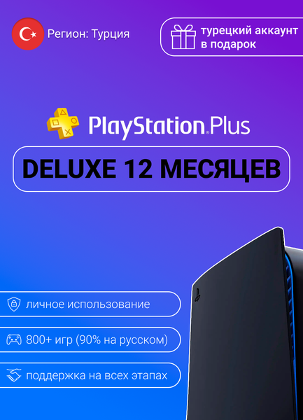 Отличие подписок можете сравнить у нас на картинках данного товара! При отсутствии турецкого аккаунта - активация аккаунта к подписке идет в подарок В наличии все тарифы(Essential, Extra, Deluxe) Подписка PS Plus Делюкс для PlayStation (PSN) (PS4/PS5) – это уникальный продукт, который предоставляет доступ к эксклюзивным играм (1000+ игр) и сервисам от компании Sony. Подписка PS Plus Deluxe позволяет вам наслаждаться играми без ограничений. Вы получаете доступ к огромному каталогу игр, включая эксклюзивные игры, которые не доступны в других регионах. В целом, подписка PS Plus Deluxe для PlayStation (PSN) (PS4/PS5) – это отличный выбор для тех, кто ценит качество, удобство и эксклюзивность. Активируем вашу подписку и ответим на все ваши вопросы с 10:00 до 22:00 по МСК Как это работает: 1. Купите активацию подписки. 2. Получите код: После покупки код моментально отправляется на указанный вами email. Полная инструкция будет у Вас на почте после покупки. Если будут трудности, Вы можете написать нам и мы Вам поможем. Вы получаете готовый аккаунт с подпиской* Почему выбирают нас: - У нас высокий уровень сервиса. На рынке мы более 2-х лет, а значит мы всегда знаем что нужно нашим клиентам! - Поддержка по любым вопросам от начала активации и даже после, спустя время! - Адекватные цены и качество обслуживания клиента всегда в приоритете.