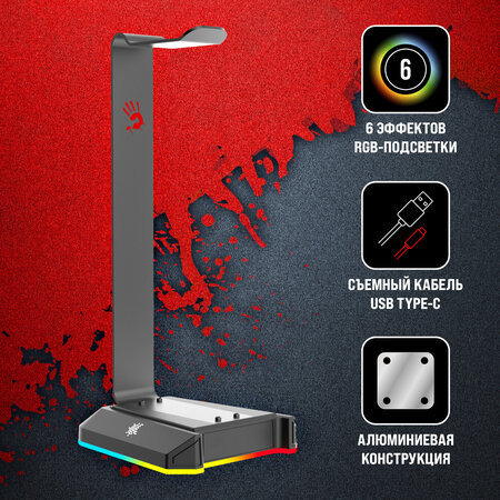 Подставка A4Tech Bloody GS2L - это стильный и функциональный аксессуар для ваших наушников или гарнитур. Она выполнена в черном цвете и имеет алюминиевую конструкцию, что обеспечивает безопасную и стабильную поддержку для ваших устройств. Подставка оснащена RGB подсветкой, которая позволяет выбрать нужный цвет одним касанием. Это добавляет эстетики и позволяет настроить подставку под ваш стиль и настроение. Подставка оборудована съемным кабелем USB TYPE-C в оплетке длиной 150 см, что обеспечивает стабильное соединение и удобство использования. Каркас из алюминиевого сплава гарантирует долговечность и надежность подставки. Подставка A4Tech Bloody GS2L - это не только стильный аксессуар, но и практичный выбор для геймеров. Она станет отличным дополнением к вашему игровому столу и поможет создать уникальную атмосферу на вашей игровой сессии. В комплект поставки входит подставка A4Tech Bloody GS2L и упаковка.