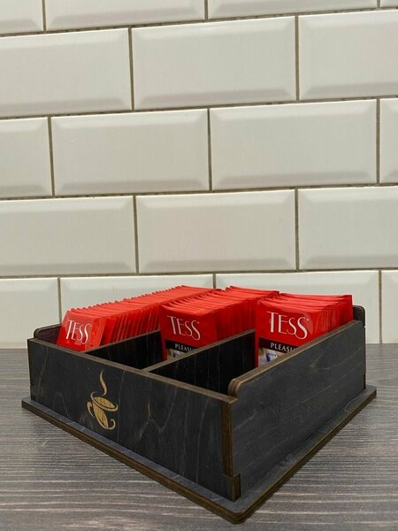 Органайзер для чайных пакетиков - полезная вещь в пространстве кухни. Универсальная подставка для хранения чайных пакетиков идеально подойдет для Вашего дома. Подставка для чайных пакетиков выполнена из фанеры 6 мм в оптимальной форме. Многофункциональный аксессуар в форме ящика с небольшими отделениями подойдет как для домашнего использования, так и для офисной кухни для набора чая в пакетиках. Лоток можно использовать как полочку для хранения чайных пакетов, для конфет, как органайзер, что позволит более рационально использовать пространство. Небольшая емкость позволяет хранить контейнер для чая в пакетиках в любом месте: на барной стойке в кафе, этажерке или полке, а стильный деревянный дизайн подойдет к любому интерьеру. Теперь они всегда будут в одном месте, а не распределяться по всем шкафам. Стильный чайный органайзер для пакетиков пригодится не только дома и на даче, но и в кафе, салоне красоты, офисном кабинете. Настольная интерьерная подставка легко поместится на полке кухонного шкафа, столешнице. Деревянный ящик - органайзер - стильный вид подставки под чайные пакетики, лаконично впишется в интерьер любого дома или заведения. Коробка для чая в пакетиках - удобный эко аксессуар для сервировки стола, порядка и хранения. Коробочка для хранения чайных пакетиков - отличный подарок для любителей чая на день рождения, 8 марта, Новый год, день учителя, день воспитателя и т. п. Изготовлена из качественной фанеры 6 мм, которая выдержит долгое использование и не деформируется со временем. Изделие следует хранить при нормальном уровне влажности вдали от нагревательных приборов и без контакта с водой. Коробочка - держатель для чайных пакетиков поможет объединить несколько вкусов в единую композицию, что сэкономит место в вашем шкафу и станет уютным дополнением к любому чаепитию. Еще больше товаров из фанеры можете найти, кликнув на картинку нашего бренда "Деревяшки".