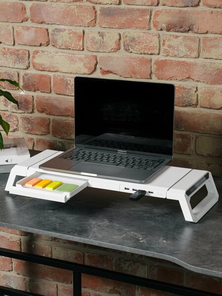 Стильная и удобная подставка для монитора включающая в себя USB-хаб из 4 портов 3.0 - 1шт, 2.0 - 3шт, подключающийся к ПК или ноутбуку, а так же подставку для телефона и органайзер. Оснащена RGB подсветкой, которую можно настраивать под свое настроение из 9 режимов. Подставка выполнена из прочного пластика, что позволит разместить на ней даже крупные мониторы, а так же имеет два уровня высоты за счет складных ножек.