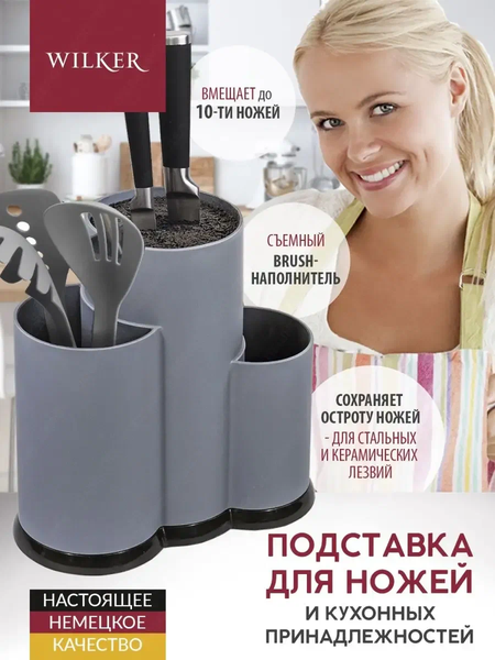 Достоинства:Классная вместительная подставка красивого графитового цвета. Сложила туда все ножи, ножницы, шумовку, 2 лопатки, кисточку кулинарную, щипцы для гриля, пресс для чеснока и молоточек для отбивания мяса.