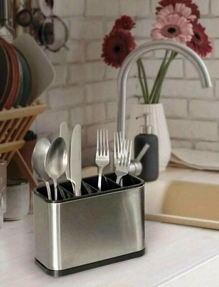 Очень удобный и функциональный органайзер для организации рабочего пространства, для хранения и сушки столовых приборов, кухонных принадлежностей и различных мелочей. Функциональная подставка для удобства, уюта, комфорта и сохранения стиля интерьера кухни, дома, квартиры и дачи. Подставка-сушилка из нержавейки для кухни прямоугольной формы с разделителями под каждый вид предметов после мытья посуды: для ложек, вилок, лопаток, ножей, мелких вещей или чайных ложек. Разборный пластиковый контейнер имеет съемный поддон с отверстием для слива воды и нескользящие силиконовые ножки. Многофункциональная и компактная сушилка для приборов из пластика и нержавеющей стали, ее можно поставить на столешницу стола, в шкаф, на полку над или рядом с раковиной мойки. Удобный кухонный аксессуар, подставка-органайзер с лотком доя хранения и сушки столовых приборов из металла. Универсальный посудосушитель - подарок бабушке, маме, сестре или подруге на день рождения, новый год , новоселье, любой праздник, 8 марта. Теги для поиска: подставка для столовых приборов, под ложки, для посуды, кухонных принадлежностей, инвентарь, металл для кухни, для раковины , настольный , ложек и вилок, половников, лоток , органайзер для хранения, держатель для ножей , порядок на кухне, украшение дома, металлическая сушка, сушилка