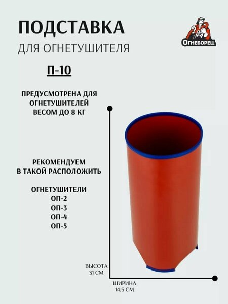 Наша компания «ООО Огнеборец» - одна из крупнейших производителей и поставщиков противопожарного оборудования. Продукция и материалы имеют соответствующие сертификаты. Предлагаем Вам напольную круглую крупку под огнетушитель. Подставка П-10 служит для удобного и безопасного размещения переносных огнетушителей, обеспечивает надежную фиксацию средств пожаротушения. При этом стильно впишется в интерьер Вашего дома или офиса. Размер подставки 14,5*14,5*31 см позволит расположить в ней переносные огнетушители для автомобиля и дома весом до 8 кг и типа ОП-2, ОП-3, ОП-4, ОУ-1, ОУ-2, ОУ-3. Изготовлена из листового металла - сталь, целиковая. В соответствии с требованиями пожарной безопасности, подставка окрашена в ярко-красный цвет, что позволяет незамедлительно обнаружить и эффективно применить средство пожаротушения в случае возникновения чрезвычайной ситуации. В комплект входит само изделие в целиковом виде и паспорт. Напольную подставку с огнетушителем рекомендовано устанавливать в любых типах помещений - общественных, административных, производственных, а также дома или в других частных объектах во имя пожарной безопасности. Берегите себя и своих близких.